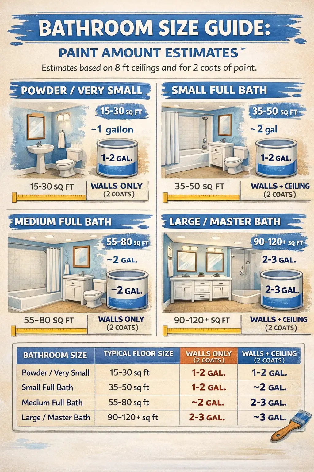 | Bathroom Size | Wall Area (sq ft)* | Paint Needed (gallons) | Total Cost Range |