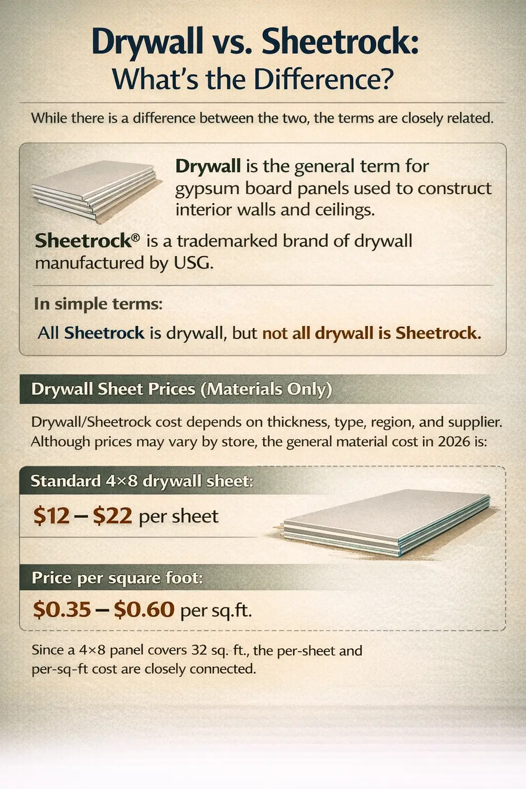 Drywall/Sheetrock cost depends on thickness, type, region, and supplier. Although prices may vary by store, the general material cost in 2026 is:
