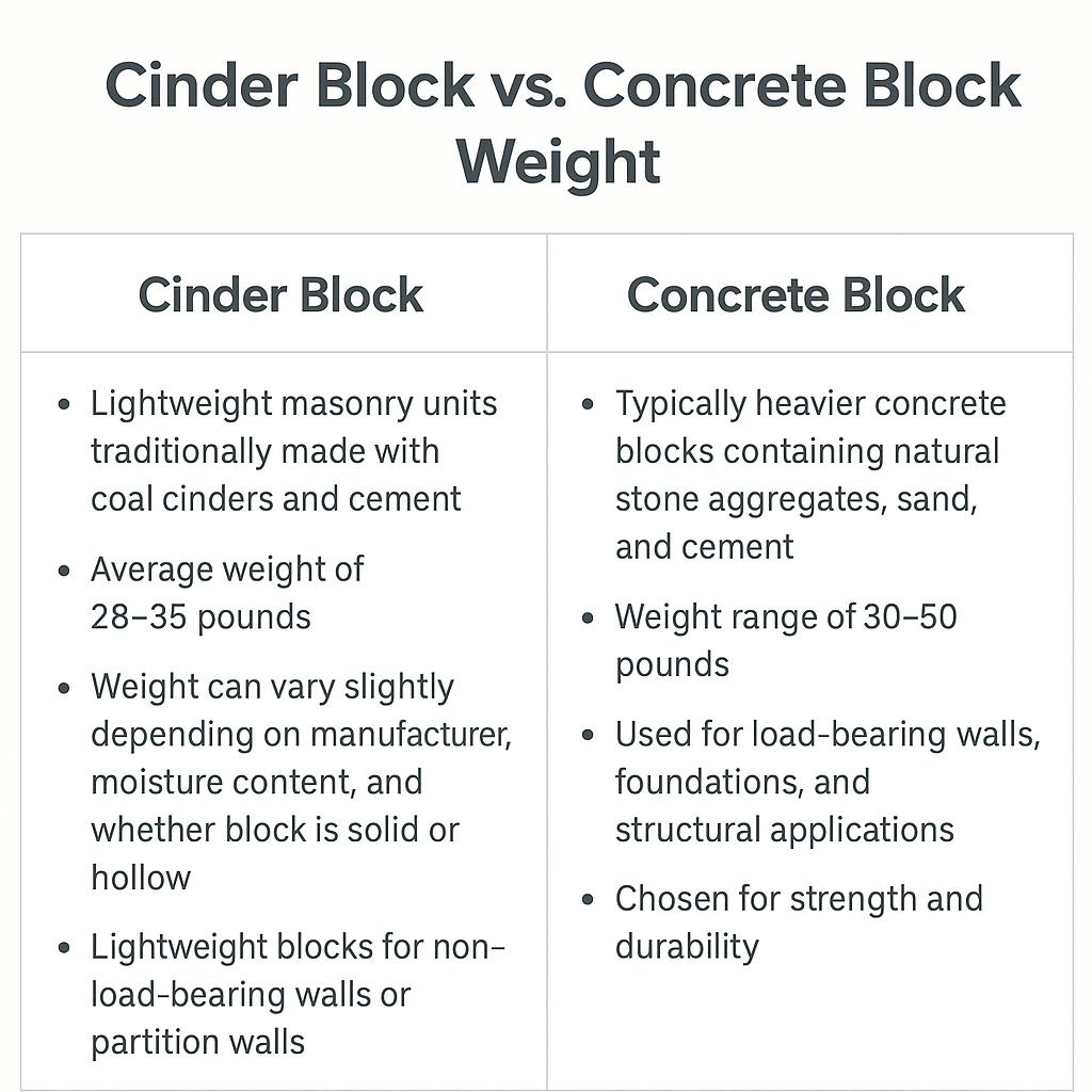 Concrete blocks are typically heavier than traditional cinder blocks because they contain natural stone aggregates, sand, and cement.