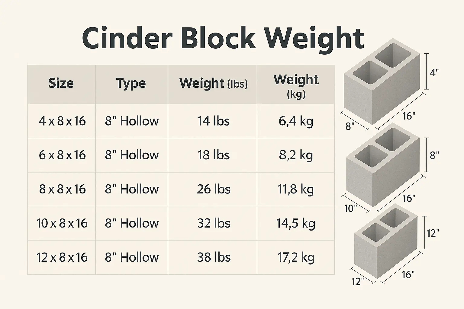 An 8x8x16 cinder block typically weighs around 30–35 pounds. This standard block size is widely used for interior and exterior walls in residential and commercial construction. Hollow cinder blocks are lighter, while solid blocks weigh more.