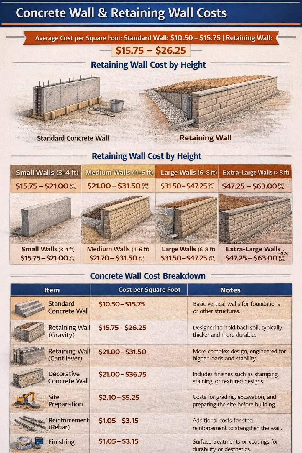 | Retaining Wall (Cantilever) | $21.00 – $31.50 | More complex design, engineered for higher loads and stability. |