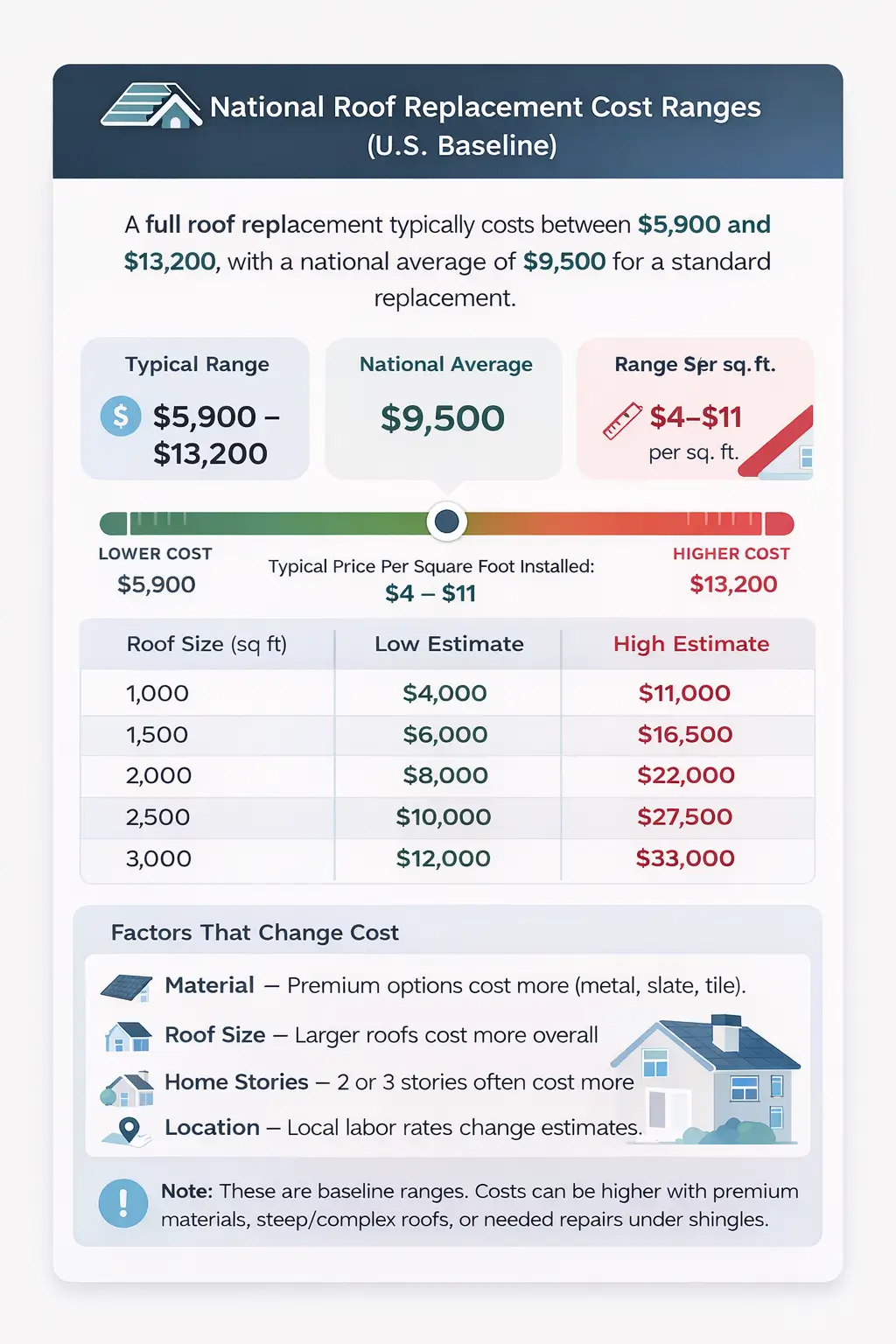 | Standard Roof Replacement | $4 – $11 | Common national estimate used for budgeting |